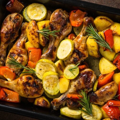 Serve the balsamic glazed chicken over the roasted vegetables, and garnish with fresh parsley.