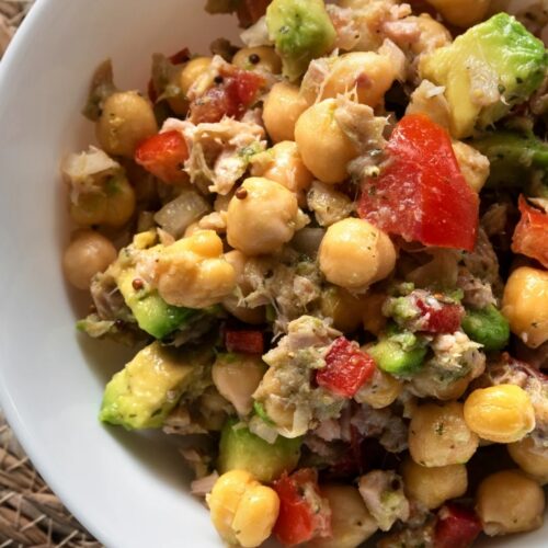 In a mixing bowl, combine the chickpeas, avocado, cherry tomatoes, red onion, and corn.